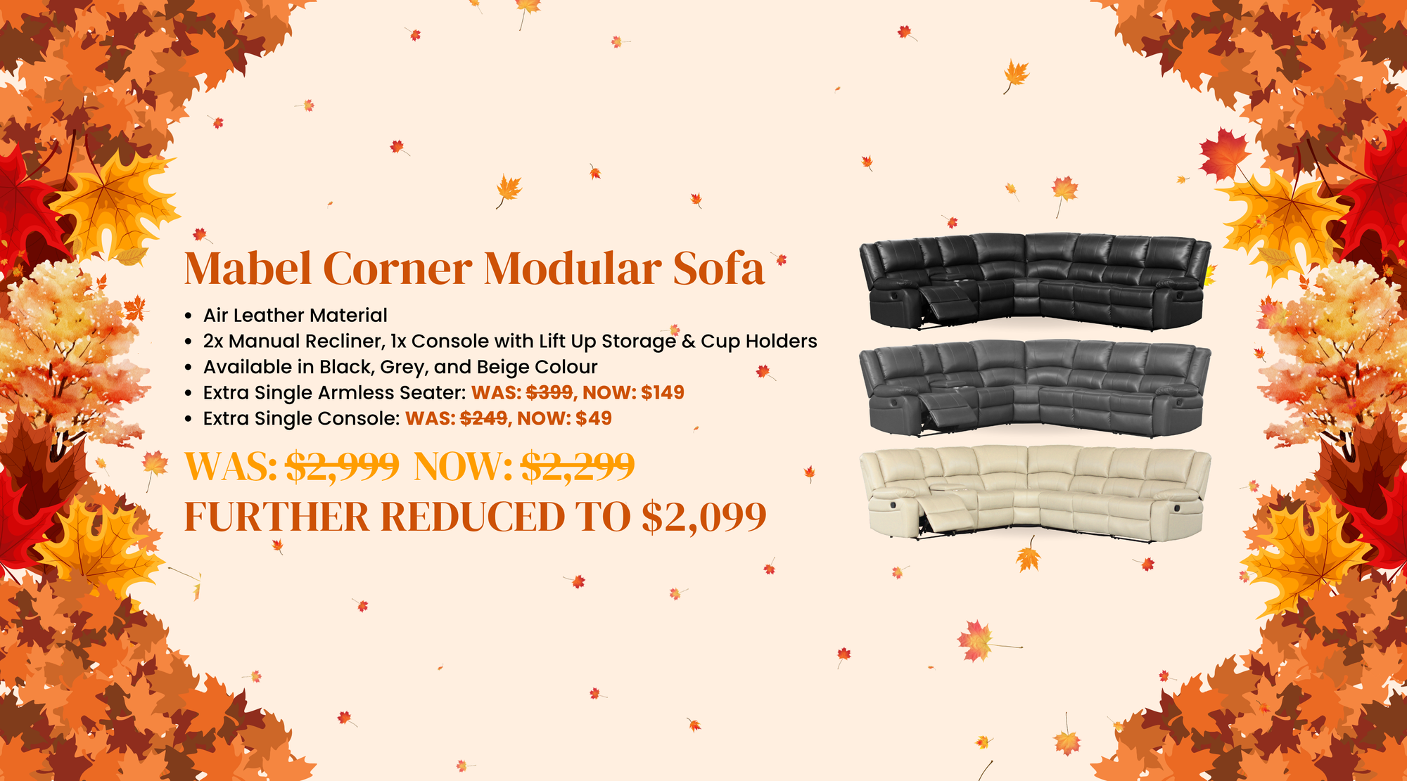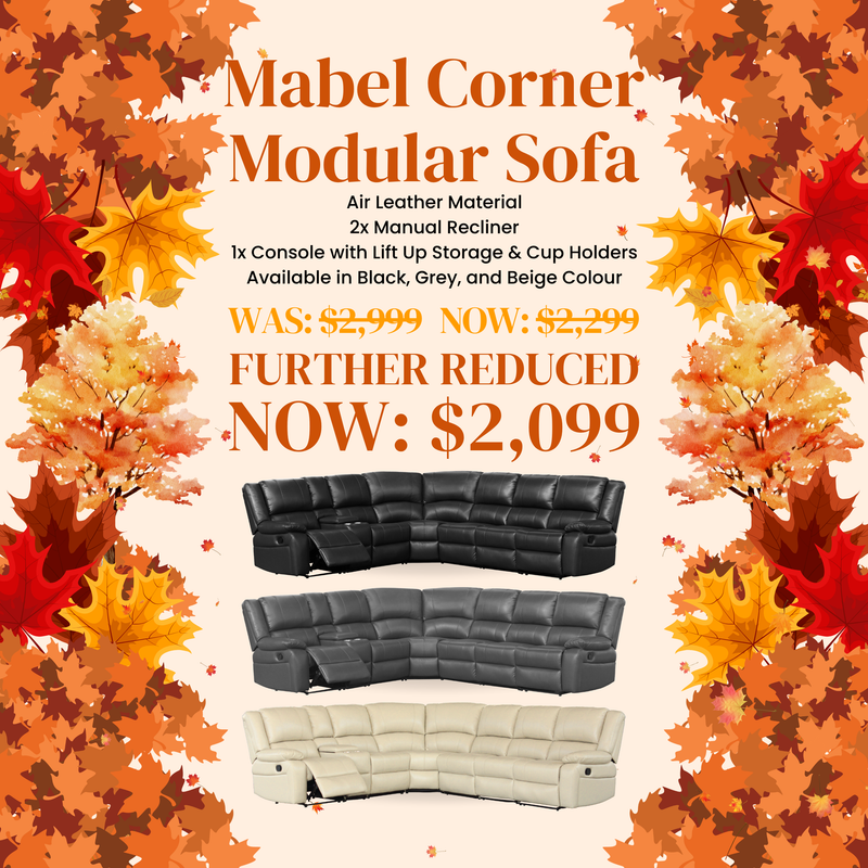 View full detailsMabel Manual 6 Seater Corner Modular WAS: $2999, NOW: $2299, Autumn Sale: $2099 Add On: Single Armless Seater: WAS: $399, NOW: $149 Single Console:...