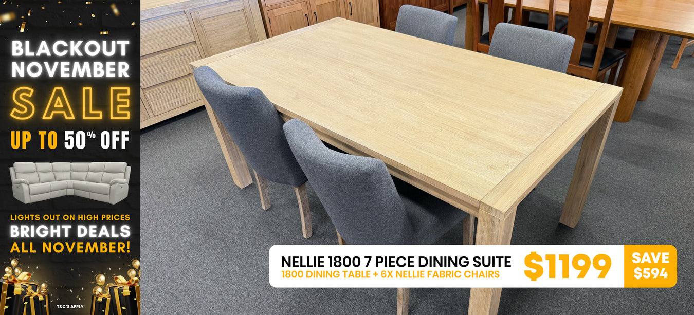 View full detailsNellie 1800 7 Piece Dining Suite New Arrival! Set Includes: 1x Nellie 1800 Dining Table and 6x Nellie Fabric Dining Chairs. Introductory Special Of...