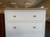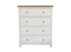 Stylish Storage with Coastal Appeal: The Sheldon Tall Chest features sturdy acacia timber framing with a pristine white finish and silver handles. Its four spacious drawers with fabric felt bottoms and heavy-duty extension runners provide versatile storage for clothing or accessories, while subtle light oak accents add a refreshing coastal touch.